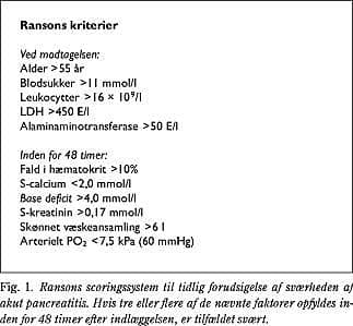Inden 24 timer efter modtagelsen blev der foretaget en UL-scanning af galdeblæren med henblik på at undersøge, om der var sten. Patienterne blev behandlet efter afdelingens protokol. Sværhedsgraden af pancreatitistilfældene blev vurderet med Ranson-scoring-systemet (Fig. 1 ) (3, 4). Diagnosen svær pancreatitis blev stillet, hvis patienten inden for 48 timer opnåede en score på tre eller flere. Patienter med svær pancreatitis fik derefter foretaget dynamisk CT (CT med i.v. kontrast) for at finde eventuelle nekroser, og i tilfælde med svær galdestenspancreatitis blev der foretaget ERCP inden for tre døgn. I tilfælde med mild galdestenspancreatitis skulle der være opnået stenfri galdeveje og være foretaget kolecystektomi inden for fire uger (dog kun sfinterotomi ved kontraindikation for operation).