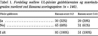 Fordelingen mellem sværhedsgrad og påviste galdeblæresten er anført i Tabel 1 .