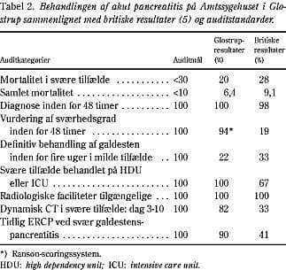 Resultater: I alt 155 patienter med førstegangstilfælde af akut pancreatitis blev identificeret inden for 48 timer (mål: 100%). Af dem havde 50 (32%) galdesten. I alt 51 tilfælde (32%) var svære, hvoraf ti døde (20%) (mål: < 30%). Mortaliteten for hele materialet (6,4%) var inden for målet på højst 10%. Objektive mål for sværhedsgraden (Ranson-scoring) blev opnået i 94% (mål: 100%) af tilfældene, CT blev udføret i 82% (mål: 100%) af de svære tilfælde, og 90% (mål: 100%) af de svære galdestenspancreatitistilfælde fik udført tidlig ERCP (< 72 timer efter indlæggelsen). Et behandlingsmål blev ikke nået: Blandt de milde tilfælde af galdestenspancreatitis blev kun 20-25% (mål: 100%) af patienterne definitivt behandlet inden for fire uger.