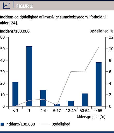 Invasiv pneumokoksygdom rammer især den ældre del af befolkningen, hvor den er forbundet med høj dødelighed (Figur 2) [24]. To pneumokokvacciner er tilgængelige, en 13-valent-proteinkonjungeret vaccine (PCV13), der har erstattet den tidligere syvvalente vaccine (PCV7), og en 23-valent-polysakkaridvaccine (PPV23). Sidstnævnte er hidtil blevet brugt til vaccination af voksne (herunder ældre).