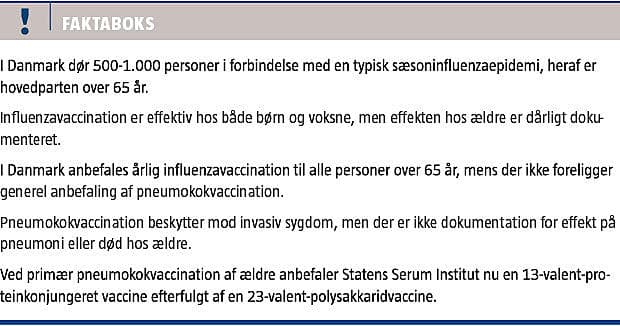 Både influenza og pneumokoksygdom er forbundet med betydelig morbiditet og mortalitet i den ældre del af befolkningen. Evidensen for effekt af vaccination mod disse sygdomme hos ældre er sparsom, og der er behov for nye, mere effektive vacciner med dokumenteret effekt.