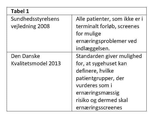 Den Danske Kvalitetsmodel (DDKM), version 2, angiver i en fodnote: »… sygehuset kan definere, hvilke patientgrupper der vurderes som i ernæringsmæssig risiko og dermed skal ernæringsscreenes«. Det har uheldigvis medført, at nogle sygehuse mener, at de selv kan fastsætte, hvem der skal screenes. Det er kedeligt, at en klar vejledning fra SST omdannes til elastik i metermål. DSKE arbejder for, at der kommer overensstemmelse mellem SST og DDKM, men indtil det er sket, må SST’s vejledning anses for et »skal«-krav, hvor enkelte veldokumenterede undtagelser er acceptable.