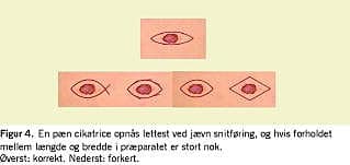 Tegn, før der skæres! Optegn så vidt muligt de planlagte incisionslinjer i hudens rynkeretning, Det giver de mindst iøjnefaldende cikatricer og mindst stramning ved lukning (Figur 1 , Figur 2 og Figur 3 ). Hvis der anvendes ellipseformet excision med længde ca. fire gange bredde, undgås »hundeører« (Figur 4 ). I de optegnede incisionslinjer lægges infiltra-tionsanæstesi. Intradermal anæstesi giver i praksis øjeblikkelig anæstesi i huden. Ved indgreb perifert eller i ansigtet kan det ofte være en fordel først at lægge ledningsblok. Et ledningsblok lægges så tidligt i forløbet som muligt, da det kræver nogle minutter for at virke. Den samme forsinkelse gælder for vasokonstriktorer!