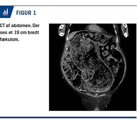 Ved en objektiv undersøgelse fandt man et spændt abdomen, hvorfor der blev foretaget CT af abdomen, hvorved man så en svært dilateret colon med en diameter på op til 19 cm pga. fækalier, men ingen tegn til mekanisk obstruktion eller perforation (Figur 1).