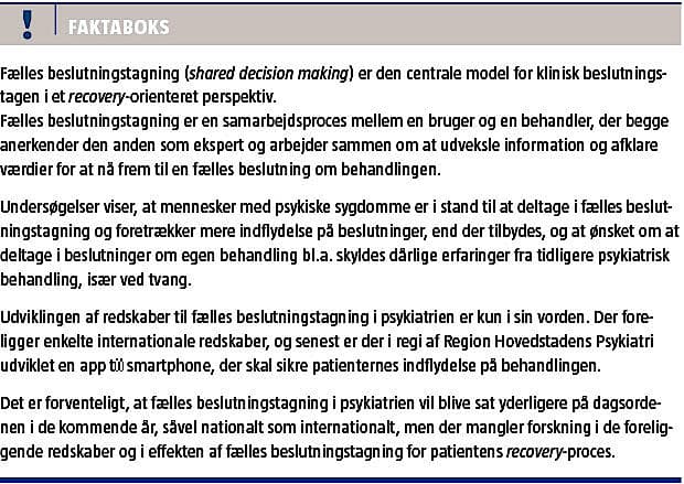 er den centrale model for kliniske beslutninger i et recovery-orienteret perspektiv [4]. Ved fælles beslutningstagning forstås en tilgang, hvor enhver behandlingsmæssig beslutning tages i samarbejde mellem patienten og dennes behandler(e). I fælles beslutningstagning betragtes patienten som en ekspert på lige fod med behandleren. Behandleren er ekspert i behandlingen, mens patienten er ekspert i sit liv, sine oplevelser af sygdommen og de ting, der betyder noget for ham/hende [5].