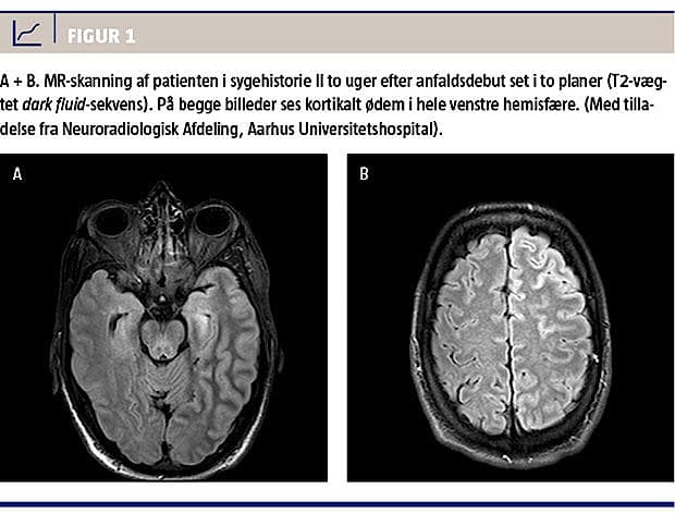 Patienten blev genindlagt, da han var 44 år, med bevidsthedssvækkelse, afasi og hemiparese, igen højfebril og med enkelte krampeanfald. MR-skanninger af cerebrum viste normale forhold ved indlæggelsen, men viste efterfølgende kortikalt ødem i hele venstre hemisfære (Figur 1). Han måtte igen overflyttes til en neurohabiliteringsafdeling. Han havde ikke haft migrænesymptomer imellem disse tilfælde.