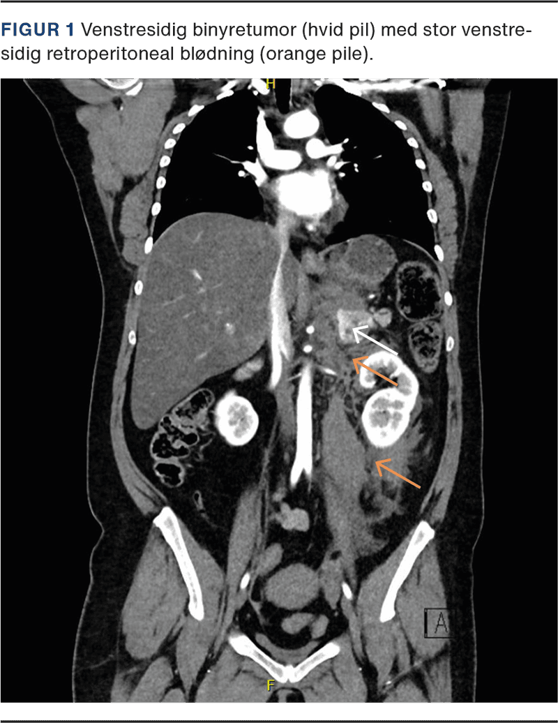 To år senere blev hun indlagt med COVID-19-infektion og pludselig stigning i blodtrykket til 223/120 mmHg ledsaget af hovedpine. Den antihypertensive behandling blev suppleret med labetalol, og hun blev henvist til et kardiologisk ambulatorium, hvor man noterede, at hun var familiært disponeret til hypertension. Hun var nu i antihypertensiv behandling med spironolacton, bendroflumethiazid, nifedipin, losartan og labetalol. Ved opfølgende besøg anførtes det, at patienten flere gange havde haft palpitationer og ubehag i brystet og maven. Der blev ordineret måling af plasmametanefriner. Kort tid efter blev patienten indlagt akut med brystsmerter, et blodtryk på 216/149 mmHg og en puls på 143 slag/min. Hun fremtrådte utilpas, bleg og klamtsvedende med ømhed i venstre side af maven. De biokemiske analyser viste kraftig leukocytose uden CRP-stigning og forhøjet kreatinin. Der blev bestilt akut CT af thorax og abdomen på mistanke om aortadissektion. Her blev der fundet venstresidig binyreblødning (Figur 1) formodentlig udgående fra en binyretumor. Patienten blev overflyttet til Rigshospitalet mhp. akut embolisering. Ved ankomsten var blodtrykket faldet til 88/62 mmHg, og en A-gasanalyse viste et fald i hæmoglobinniveauet fra 8,1 til 7,2 mmol/l. Hun blev akut emboliseret i både aa. suprarenales media og superior.