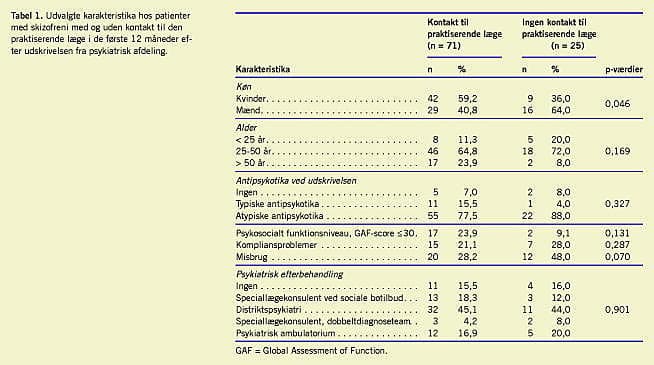 Undersøgelsesgruppen omhandler overvejende patienter med et længerevarende sygdomsforløb. Der indgår således kun seks (6, 3%) nydiagnosticerede. I Tabel 1 ses, at 71 (73,9%) af de 96 patienter havde kontakt med den praktiserende læge de første 12 måneder efter udskrivelsen fra Psykiatriske Afdeling. Blandt de kvindelige patienter havde 42 (88,2%) haft kontakt med egen læge, mens dette var tilfældet for 29 (64,4%) mandlige patienter (p = 0,046).
