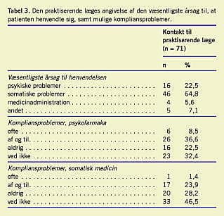 Blandt de patienter, som blev behandlet af speciallægekonsulenter eller læger ved psykiatrisk ambulatorium, vurderede egen læge, at 68,8% havde kompliansproblemer med den psykofarmakologiske behandling, mens dette var tilfældet hos 31,3% af patienterne, der blev behandlet af læger i distriktspsykiatrien (p = 0,034). Der var ingen signifikant forskel ved den somatiske behandling.