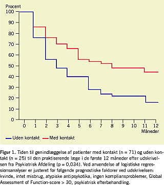 Figur 1 belyser, i hvilket omfang den praktiserende læges indsats har betydning for patienternes indlæggelsesmønster på Psykiatrisk Afdeling,. Der var signifikant færre patienter med kontakt til den praktiserende læge, som blev genindlagt i forhold til patienter uden kontakt (54,9% versus 84,0%), og patienterne, der havde kontakt, forbrugte signifikant færre sengedage (gennemsnitligt 39 dage versus 96 dage, p = 0,013). De angivne signifikansniveauer er justeret for de væsentlige prognostiske faktorer, der er angivet under figuren.