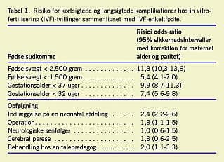 Tvillinger har en væsentligt større neonatal risiko end enkeltfødte, og da IVF-børn i dag udgør op mod 5% af den samlede fødselskohorte, er IVF-tvillingefødselsraten et ikke ubetydeligt problem (Tabel 1 ) [1]. En anden negativ effekt af oplægningen af to embryoner er, at en ud af ti IVF-enkeltfødte fødes efter en vanishing twin -graviditet, dvs. at en tvilling er forsvundet i graviditeten. Disse overlevere af en vanishing twin er en af årsagerne til, at IVF-enkeltfødte har en større risiko for præterm fødsel og lav fødselsvægt end børn, der er født efter spontan befrugtning [2].