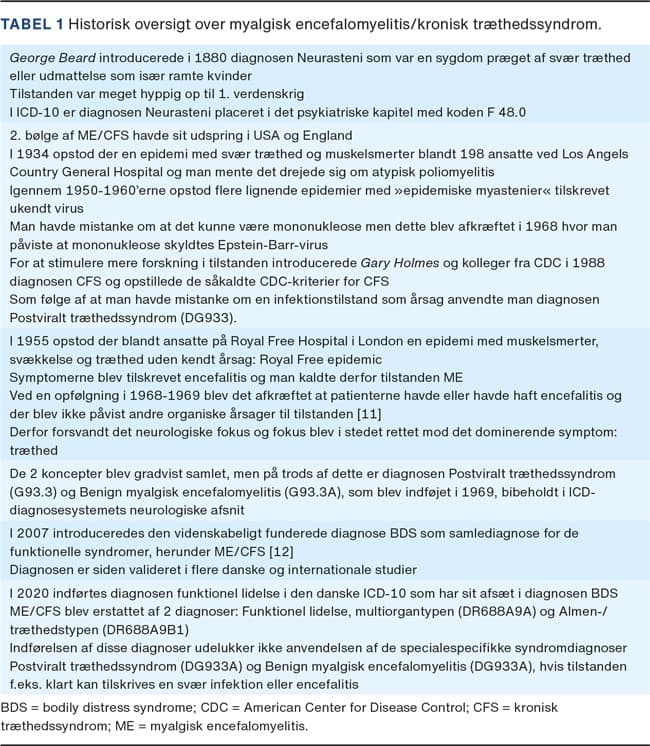 En historisk oversigt over ME/CFS fremgår af Tabel 1. I forbindelse med først IOM-rapporten fra Institute of Medicine, USA, og nu arbejdsgruppen til revision af NICE 2007-guidelines til behandling af ME/CFS er der sket det, at ME-samfundet (dvs. både patientorganisationen og de læger og forskere, der identificerer sig med og arbejder målrettet for at understøtte miljøets holdninger) har fået en altafgørende indflydelse i disse arbejdsgrupper [1, 2, 8, 13]. Hvor der i USA har været sparsomt fagligt modspil til IOM-rapporten, har den nye opdaterede NICE-guideline været udsat for stærk kritik i høringsfasen. Der kom over 4.000 indsigelser, og tre medlemmer med stor klinisk erfaring forlod komitéen i protest mod dens anbefalinger. Herudover blev et medlem ekskluderet pga. inhabilitet, fordi han var ansat i en patientforening for ME. Indsigelserne medførte kun få ændringer. Efter udgivelsen har Royal College of Physicians sammen med en række underorganisationer rejst kritik af de nye anbefalinger [13].