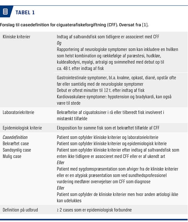 Ciguaterafiskeforgiftning (CFF) skyldes indtag af ciguatoksin (CTX), som dannes i flagellater fra koralrev i tropiske og subtropiske havområder. CTX ophobes via fødekæden i revfisk, er smagsløs, farveløs, lugtfri samt upåvirkelig af tilberedning og konservering. Den globale incidens på 20.000-50.000 tilfælde/år er formentlig underestimeret pga. underdiagnosticering og -rapportering [1-3]. Over 400 fiskearter kan ophobe CTX [2]. De typiske patientsymptomer fremgår af Tabel 1. De endemiske områder for CFF er Det Indiske Ocean, Det Caribiske Hav, Stillehavet og Atlanterhavet [1, 3]. Pga. international fiskehandel og global turisme ses CFF over hele verden [1, 2, 4], og flere tilfælde kan derfor forventes i Danmark.