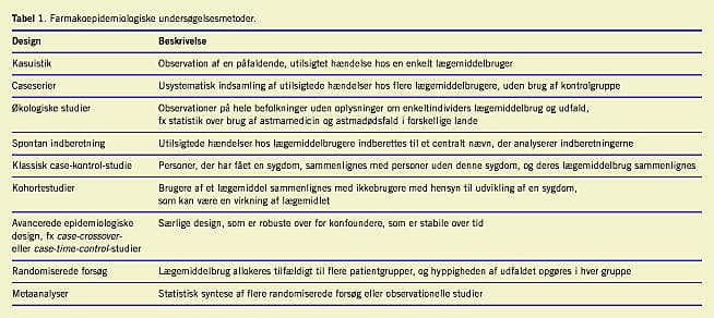 Lægemiddelvirkninger kan studeres i randomiserede og nonrandomiserede (observationelle) design. Ved randomiserede studier fordeles lægemiddel og placebo ved lodtrækning, og man vil i princippet kunne antage, at de personer, som har fået lægemidlet, er sammenlignelige med dem, som ikke har fået det. I modsætning hertil vil man i det observationelle studie lade personerne og deres behandlere selv afgøre, om patienten skal behandles eller ej. Forskeren vil skaffe oplysninger om deltagernes lægemiddelbrug uden at påvirke det aktivt og vil observere forekomsten af utilsigtede hændelser hos brugere vs. hos ikkebrugere af lægemidlet. De to hyppigst anvendte studiedesign er kohorte- og case-kontrol-designet. I et kohortestudie sammenlignes brugere og ikkebrugere af lægemidlet (eller brugere af forskellige lægemidler), og incidensen af en given utilsigtet hændelse, f.eks en mavesårsblødning, opgøres i hver gruppe. I det klassiske case-kontrol-studie vil man sammenligne personer med en given sygdom, f.eks. blødende mavesår, med en kontrolgruppe uden denne sygdom. Lægemiddelekspositionen opgøres for de to grupper. Hvis lægemidlet er en årsag til sygdommen, vil der alt andet lige være flere brugere blandt de syge end blandt personerne i kontrolgruppen [18], og fordelingen de to grupper imellem indikerer styrken i relationen mellem lægemidlet og virkningen. I nyere teknikker som f.eks. case-base-studiet og nested case-kontrol-studiet udnyttes kohortedesignets fordele, men med et mindre behov for materiale. En nærmere redegørelse for argumentationen bag disse teknikker vil falde uden for denne artikels rammer. Der kan henvises til standardværker [19].
