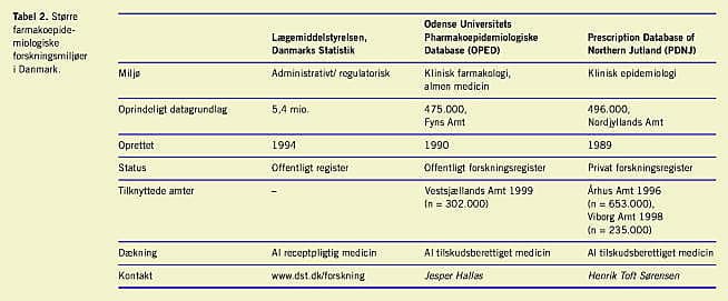Der er tre større forsknings- og udviklingsmiljøer i Danmark, hvor man beskæftiger sig med farmakoepidemiologi (Tabel 2 ). Prescription Database of Northern Jutland, PDNJ og Odense Universitets Farmakoepidemiologiske Database, OPED, har eksisteret siden 1989 og 1990 og dækker henholdsvis Nordjyllands og Fyns Amter (population henholdsvis 496.000 og 475.000). I databaserne er der indsamlet oplysninger om samtlige indløsninger af tilskudsberettiget medicin. Hver receptpost indeholder CPR-nummer, dato for indløsning, apotek, ydernummer og en nøjagtig identifikation af den udleverede vare og mængde. Registrene er baseret på rutinemæssigt indsamlede oplysninger om tilskudsrefusion, som anvendes i afregningen mellem amterne og de enkelte apoteksfilialer. Da oplysninger som indikation og dosering ikke har direkte betydning for tilskudsrefusionen, er disse ikke registreret, ligesom ingen af registrene indeholder data for receptpligtig medicin uden tilskud, f.eks. benzodiazepiner, orale kontraceptiva og visse antibiotika [37]. Begge registre anvendes til såkaldte record-linkage -studier, hvorved receptoplysningerne kobles sammen med oplysninger om udfald, for eksempel fra registre over sygehusindlæggelser. PDNJ er udsprunget af et klinisk epidemiologisk forskningsmiljø. Hovedinteressen har været lagt på studier af lægemiddeleffekter, herunder skadevirkninger af lægemiddelbrug hos gravide og diverse virkninger af NSAID. OPED er udsprunget af klinisk farmakologiske og almenmedicinske forskningsmiljøer og har i videre omfang fokuseret på udvikling af redskaber til belysning af ordinationsmønstre, kvalitetsindikatorer og interventioner. Kontaktpersonerne for forskere, der måtte ønske at gøre brug af registrene, er denne artikels to forfattere.