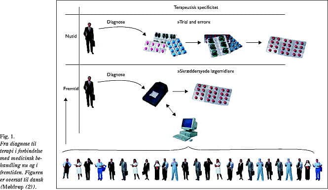 Alt peger således i retning af, at medicinsk praksis vil bevæge sig væk fra one size fits all til mere skræddersyede terapeutiske regimina inden for ganske få år, som illustreret på Fig. 1 (20, 21). Da lægemidlerne er udviklet på baggrund af genetiske profiler, vil patienten i fremtiden blive klassificeret i forhold til disse profiler, således at det specifikke lægemiddel kan udvælges af den ordinerende instans. Prospektet er, at dette vil foregå ved brug af en genchip, som analyseres i konsultationen ved hjælp af et tilhørende software.