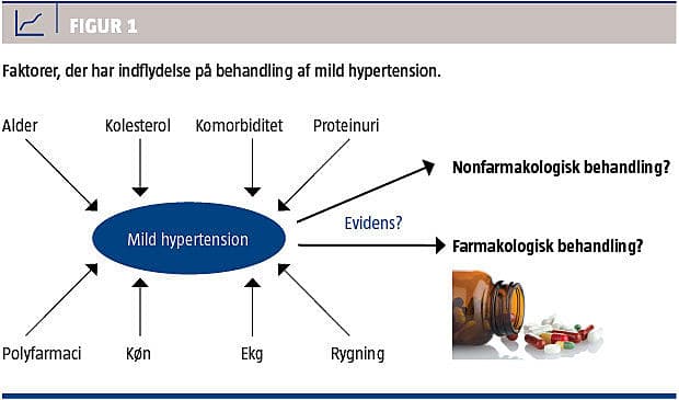 I et nyligt publiceret Cochranereview konkluderede man, at antihypertensiv behandling af voksne patienter med grad 1-hypertension/mild hypertension (systolisk blodtryk 140-159 mmHg, diastolisk blodtryk 90-99 mmHg) ikke reducerer hverken sygelighed eller dødelighed [3]. Analysen var baseret på fire randomiserede, kontrollerede undersøgelser, der omfattede i alt 8.912 patienter. Studierne var alle af ældre dato og baseret på ældre behandlingsregimer, hvor f.eks. betablokkere blev anvendt som førstevalg/monoterapi, eller hvor antihypertensiv farmakologisk behandling initieredes alene ud fra blodtrykkets størrelse. I dag vil man formodentlig i de fleste tilfælde før påbegyndelse af medicinsk behandling vurdere patientens samlede kardiovaskulære risiko på basis af blodtryksniveau, herunder tilstedeværelsen af risikofaktorer som diabetes, hjerte-kredsløbs-sygdom og nyresygdom [4-6].