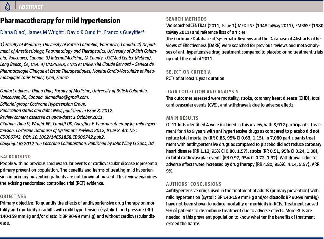 Diao D, Wright JM, Cundiff DK et al. Pharmacotherapy for mild hypertension. Cochrane Database Syst Rev 2012;8:CD006742.