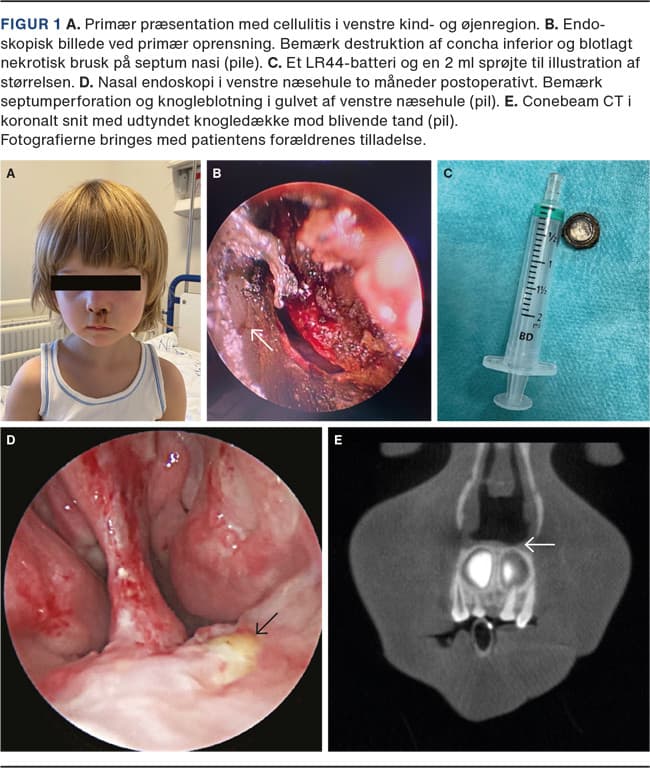 Ved en anterior rinoskopi opstod der mistanke om, at der var tale om et metallisk fremmedlegeme, og da det fremstod fastklemt, blev det besluttet at foretage eksploration i generel anæstesi samme aften. Under nasal endoskopi oprensedes betydelige mængder brunligt sekret fra særligt venstre næsehule. Fastklemt mellem concha inferior og septum nasi i venstre næsehule fandt man et LR44-knapbatteri (Figur 1B). Fjernelsen var ukompliceret, men der sås en gennemgående 1 cm2 nekrose fortil på den bruskede septum samt i næsegulvet og erosion af den forreste tredjedele concha inferior (Figur 1C). Der blev anlagt silikoneplade med hydrocortison, oxytetracyclin og polymyxin på begge sider af septum nasi for at beskytte slimhinderne og undgå dannelse af synekier. Den følgende dag blev hun udskrevet med amoxicilin med clavulansyre efter vægt i syv dage. Der blev planlagt oprensninger to gange om måneden. To måneder efter fandtes der blivende septumperforation samt knogleblotning i venstre næsehule, som på cone beam CT sås at være udtyndet ned mod det blivende tandsæt (Figur 1D og Figur 1E).