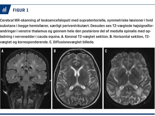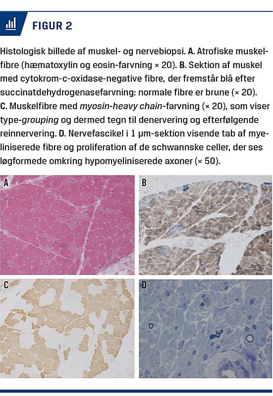 Seks måneder senere fik patienten progredierende svaghed i benene. Der påvistes ekstern oftalmoplegi, global muskulær atrofi, symmetrisk nedsat kraft, arefleksi og tab af vibrationssans. En elektrofysiologi viste fremskreden demyeliniserende sensorisk, motorisk og autonom neuropati og autonom dysfunktion. Cerebrospinalvæsken var normal. En MR-skanning af neuroaksen (Figur 1) viste leukoencefalopati med symmetriske hvid substans-læsioner. Undersøgelse af muskel- og nervebiopsi viste atrofiske muskelfibre og svær atrofi med næsten komplet tab af myeliniserede aksoner (Figur 2). En metabolisk undersøgelse viste forhøjet niveau af thymidin og deoxyuridin i plasma, hvilket er diagnostisk for MNGIE og detekteres som en del af undersøgelsen af puriner og pyrimidiner i plasma eller urin.