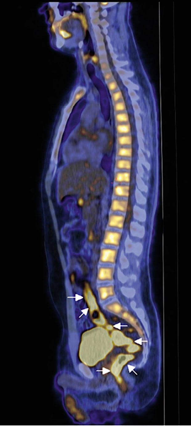 Da han nu igen havde haft intermitterende feber gennem måneder uden erkendt årsag, blev han henvist til PET/CT. På PET/CT’en ses kraftigt øget fluordeoxyglukose (FDG)-optagelse og dermed metabolisme i den terminale colon sigmoideum, rectum og analkanalen, med fortykket tarmvæg og skip lesions på lavdosis-CT, hvilket er foreneligt med mb. Crohn [1].