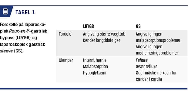 Indtil der foreligger bedre data fra de øvrige bariatriske procedurer, anbefales det, at overvægtige patienter tilbydes enten LRYGB eller GS. Vægttabet synes at være højere [23] ved LRYGB end ved GS (Tabel 2), og der er formentlig en mindre andel af patienterne, der ikke opnår et varigt vægttab med GS (Tabel 2) [1, 23]. Den første femårsopfølgning af patienter, der har fået foretaget GS) har mht. T2DM vist, at 44% fik tilbagefald af deres T2DM [24]. Ydermere er store hiatushernier og GS associeret med meget svær refluks [22, 25, 26], der teoretisk kan øge risikoen for cardiacancer [25]. Fordelen ved GS er til gengæld, at den er teknisk mere simpel end LRYGB, risikoen for mangeltilstande er minimal (Tabel 1), og der er ikke risiko for IH (Tabel 2) [29].