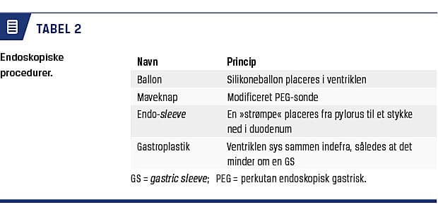 En intragastrisk ballon (Tabel 1) er en gastroskopisk placeret silikoneballon, der anbringes i ventriklen, fyldes med saltvand eller metylenblåt og virker volumenindskrænkende. Ballonen tåler mavesyre i 6-12 måneder [29]. Smerter og kvalme er de hyppigste komplikationer i forbindelse med ballonen og er beskrevet hos op til 33% [29]. Fem år efter seponering af ballonen har en undersøgelse af 500 patienter vist et gennemsnitligt vægttab på 5,4 kg [30]. Proceduren er reversibel, men evidensen er mangelfuld, og effekten på patienternes metabolisme og endokrine funktion er ukendt.