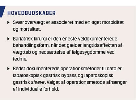 Bariatrisk kirurgi er den eneste veldokumenterede behandlingsform til opnåelse af et varigt vægttab. Der findes en række forskellige behandlingsformer, men de fleste er uden sufficient dokumentation. Både LRYGB og GS er sikre procedurer med gode resultater, men LRYGB er forsat den bedst dokumenterede procedure mht. langtidsdata.