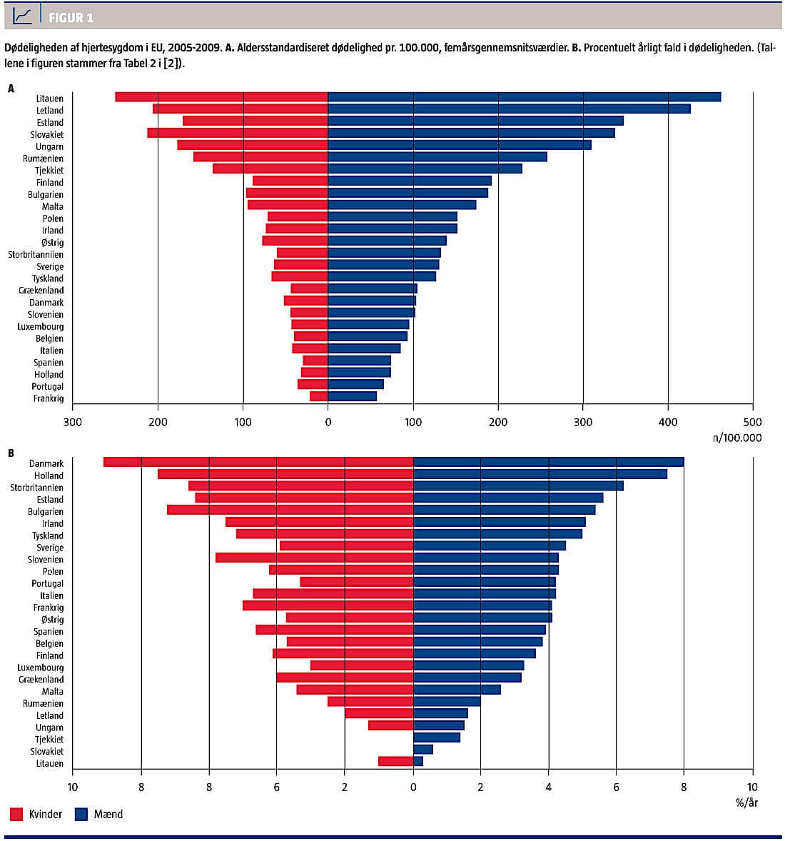 I Europa sker 46% af alle dødsfald på grund af kardiovaskulær sygdom (CVD), som dermed fortsat er den største bidragyder til mortalitet. Denne mortalitet er overvejende forårsaget af iskæmisk hjertesygdom (IHD). Dødeligheden af IHD er imidlertid faldet med næsten 50% i mange europæiske lande igennem de seneste to årtier; men med store forskelle. Faldet er mindst i Polen og Ungarn (7%) og højest i Danmark (72%) [1, 2]. Faldet i IHD-dødeligheden i Danmark var især markant i 2001-2010 (Figur 1).