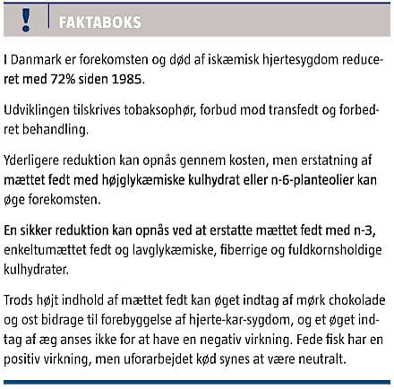 Reduktion af mættet fedt har været en hjørnesten i forebyggelsen af CVD og byggede initialt på Keys fund af sammenhængen mellem indtag af mættet fedt og IHD-mortalitet i forskellige lande [10]. Senere er det især risikomarkører, som total- og lavdensitets-lipoproteinkolesterol, der er blevet anvendt, selvom det er erkendt, at disse er utilstrækkelige [11]. Store systematiske gennemgange af de observationelle studier og interventionsstudier med hårde endepunkter har ikke sikkert underbygget, at en reduktion af mættet fedt har spillet en væsentlig rolle. Ernæringsrådet konkluderede i 1995: »I flere årtier har øget indtag af n-6-flerumættet fedt som erstatning for mættet fedt været en væsentlig faktor i kostprincipper rettet mod såvel primær som sekundær forebyggelse af iskæmisk hjertesygdom. Resultaterne af de i dag tilgængelige sekundære forebyggelsesundersøgelser støtter ikke dette kostprincip« [12]. Det var især interventionsstudier, som gav mistanke om en manglende positiv effekt. I et Cochranereview af studier med hårde endepunkter konkluderede man i 2004, at kostændringer med nedsættelse eller modificering af kostens fedtindhold ser ud til at reducere forekomsten af CVD [13]. Dette er statistisk signifikant for studierne