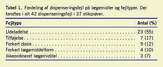 På fire modtageafsnit og 24 ikkeakutte afsnit indsamledes i alt 656 stikprøver, hvoraf 619 var dispenseret fejlfrit (94,4%; KI: 92,3-95,9%). Fejl forekom i 37 stikprøver (5,6%; KI: 4,1-7,7%), hvoraf fem stikprøver havde to fejl.