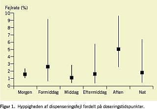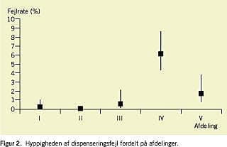 Resultater: I alt 619 af 656 stikprøver (94,4%) var fejlfrie (95% sikkerhedsinterval (KI): 92,3-95,9%). Blandt 2.360 fejlmuligheder (2.336 dispenserede samt 24 ordinerede, men ikke dispenserede doser) fandtes 42 fejl, fejlrate 1,8% (95% KI: 1,3-2,4%), 55% var udeladelsesfejl. Logistisk regression viste, at fejl ikke var relateret til, om dispensering og administration foregik i en ubrudt arbejdsgang, men til doseringstidspunkt og antal dispenserede doser i stikprøven. Endvidere varierede fejlraten fra afdeling til afdeling.