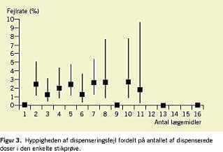 Fejlraten varierede over døgnet (Figur 1 ) fra afdeling til afdeling (Figur 2 ) og med antallet af lægemidler i stikprøven (Figur 3 ). Mens fejlraten var 3,3% (KI: 2-5,3%) på afsnit, hvor man anvendte ubrudt arbejdsgang, var den kun 1,4% (KI: 0,9-2%) på afsnittene med afbrudt arbejdsgang, p = 0,005. Den logistiske regressionsanalyse viste, at dispenseringsfejl var associeret til afdeling (p = 0,0001), dispenseringstidspunkt (p= 0,007) og antal dispenserede doser i stikprøven (p < 0,0001), mens det ikke havde nogen betydning for forekomsten af dispenseringsfejl, om dispensering blev foretaget i en ubrudt eller afbrudt arbejdsgang (p = 0,22).