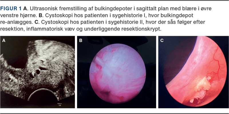 I. I 2007 blev en 42-årig kvinde behandlet for stressinkontinens med bulkingoperation på et regionshospital. Der blev injiceret tre depoter kl. 3, 6 og 9. Operationen forløb ukompliceret, og kvinden blev udskrevet med fri vandladning og under 100 ml residualurin. Ved kontrolundersøgelse 6 mdr. senere var kvinden tilfreds og kontinent ved fysisk aktivitet. I efteråret 2023 blev kvinden tilset af privatpraktiserende gynækolog på grund af postmenopausal blødning. Ved transvaginal UL-undersøgelse blev der gjort et tilfældigt fund af en cystisk solid proces på 25 × 20 mm i nær relation til blærehals. Patienten blev henvist i pakkeforløb til urologisk afdeling. Ved urologisk speciallæge blev der foretaget cystoskopi: polyp med glat overflade i relation til blærehalsen. Polyppen blev beskrevet som ikkepapillomlignende. Der blev udført transuretral resektion af blæretumoren (TUR-B) forårsaget af uspecifikke forandringer på blærehalsen. Histologisvar: inflammation, uspecifikke forandringer, ingen tegn på malignitet. I juni 2024 blev der henvist til universitetshospital på grund af udtalte urininkontinensgener. Cystoskopibeskrivelse: distale del af urethra var upåfaldende, sphincter var velmarkeret og kunne kontrahere sig, proksimalt for sphincter var åbenstående urethra mod blærehals, hvor der sås resektionskaviteter efter tidligere bulkingdepoter kl. 4-5 og 7-8. Det blev vurderet muligt at foretage re-bulking kl. 6, 11 og 13. I september 2024 blev der foretaget re-bulking (Figur 1 B), som var udfordret af arvæv og minimalt funktionel slimhinde, men nogen lukkefunktion blev opnået.