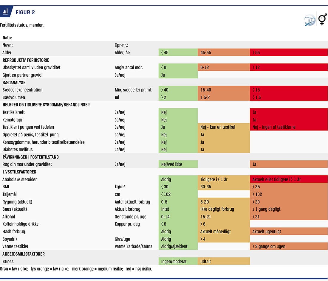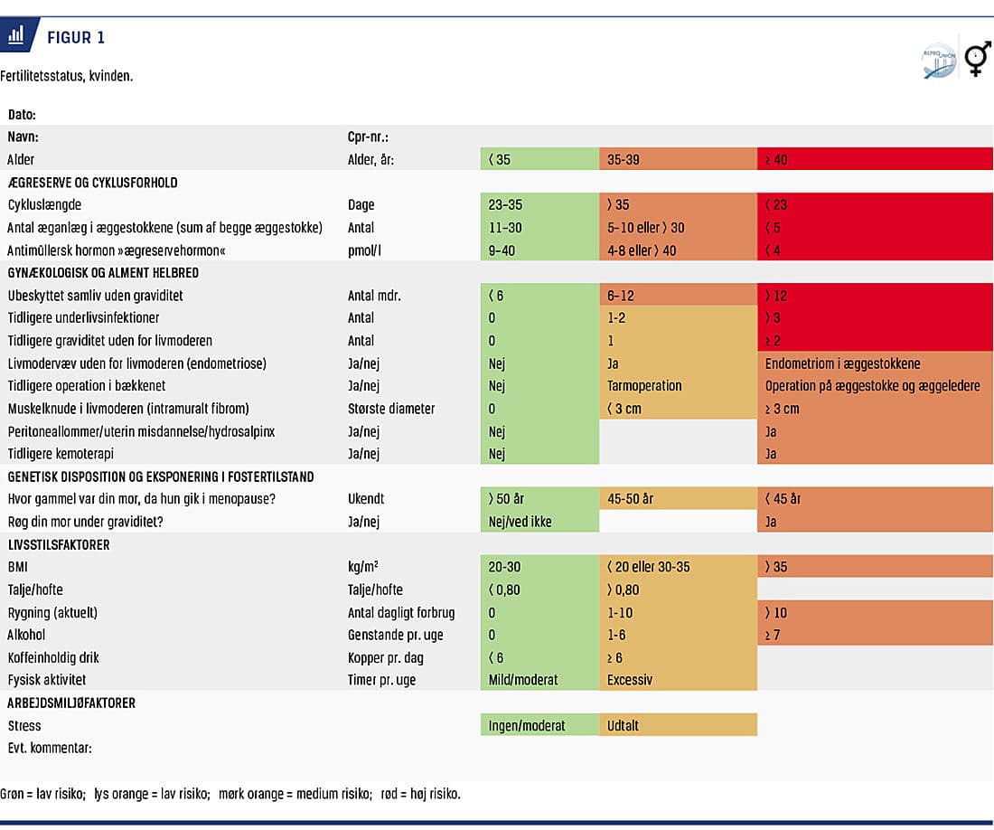 En konsultation i FR består af en samtale med en fertilitetslæge [2], der udfylder et risikovurderingsskema om kendte eller formodede risikofaktorer for nedsat frugtbarhed (Figur 1 og Figur 2). Kvinder vaginalskannes for at undersøge antallet af antrale follikler (AFC), ovarievolumen og evt. patologi (fibromer eller endometriose). Herudover måles niveauet af antimüllersk hormon (AMH). Både AFC og AMH-niveau giver et estimat på ægreserven [3]. Mændene afleverer en sædprøve, hvori sædkvaliteten bestemmes ved manuel tælling og bedømmelse af motilitet. Morfologien vurderes ikke.