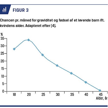 Sammenhængen mellem kvindens stigende alder og hendes fekunditet er velkendt [4]. Kvindens ægreserve defineres som antallet af primordialfollikler i ovarierne. Det største ægtab sker i fosterlivet. Ved fødslen har en kvinde ca. 2 mio. æg. Ved pubertetens indtræden har langt de fleste af æggene undergået en »programmeret celledød«, og der er knap en halv mio. æg tilbage [6]. Ved hver ægløsning modnes ca. 1.000 æg, og det skønnes, at der er under 1.000 primordialfollikler tilbage, når kvinden går i menopause, hvilket gennemsnitligt sker i 51-årsalderen. Den subfertile periode starter dog allerede 10-12 år før menopausen [7]. Derfor ophører langt de fleste kvinder med at kunne få børn i starten af 40’erne. Omkring 3% går i menopause som 45-årige, og 1% før de fylder 40 år, hvorfor deres subfertile periode startede, allerede da de var i 30’erne.