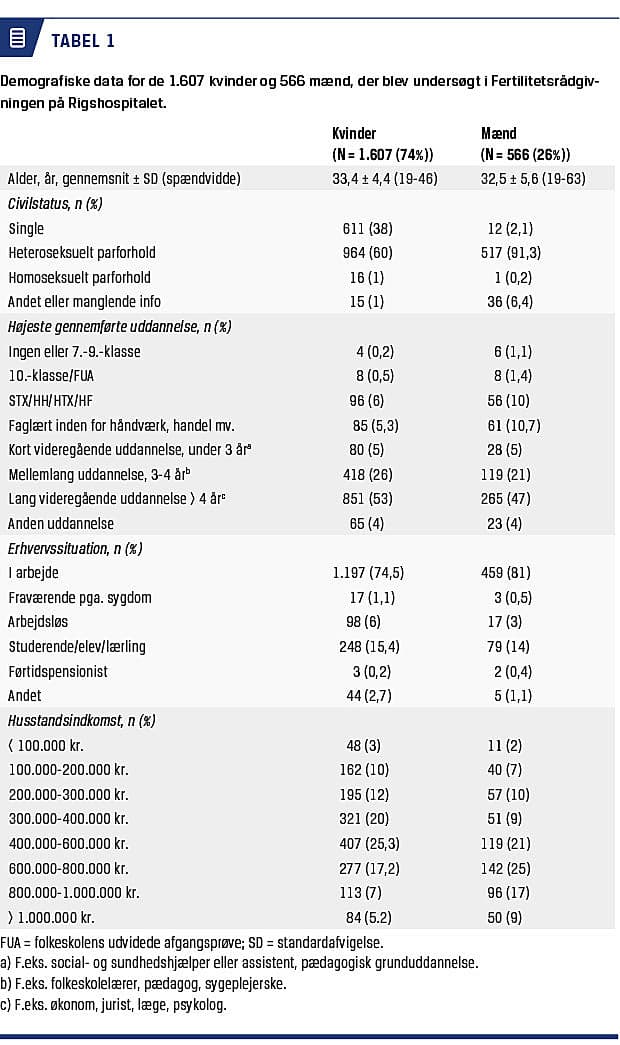 Tabel 1 viser de demografiske faktorer for de mænd og kvinder, der er blevet undersøgt i FR frem til april 2016. Som det fremgår af tabellen, er kvinderne typisk midt i 30’erne, højtuddannede samt i arbejde, og over halvdelen er i parforhold (60%). Mændene er ligeledes i 30’erne, højtuddannede samt i arbejde med god indkomst, og langt de fleste er i parforhold (91%). Motivationen for at søge FR var hos kvinderne, der var i parforhold: bekymring for fremtidig fertilitet (73%), ønske om at vide, hvor længe en graviditet kunne udskydes (69%), mulighed for at optimere/bevare fremtidig frugtbarhed (65%) og nuværende graviditetsønske (45%). For enlige kvinder var den primære motivation at afklare, hvor længe en graviditet kunne udskydes (90%), og bekymring for fremtidig frugtbarhed (71%). Mændenes motiver var: bekymring for fremtidig frugtbarhed (66%), optimering af fremtidig fertilitet (61%), fordi partneren ønskede det (54%), og pga. aktuelt graviditetsønske (51%). For begge køn angav 99%, at de fandt rådgivningen relevant og brugbar. 96-99% ville anbefale det til andre.