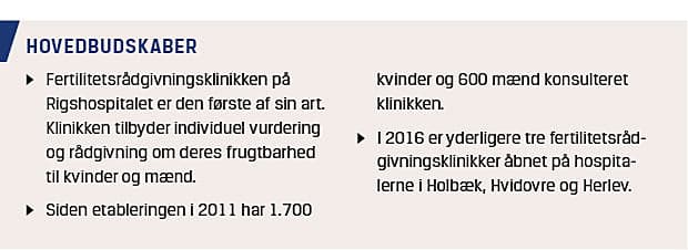 i løbet af deres liv. Indtil nu har 1.700 kvinder og 600 mænd konsulteret FR. Tre andre rådgivningsklinikker, der er baseret på samme koncept, er oprettet på Holbæk Sygehus, Hvidovre Hospital og Herlev Hospital (www.fertilitetsraadgivning.dk). Klinikkerne er primært drevet vha. eksterne projektbevillinger.