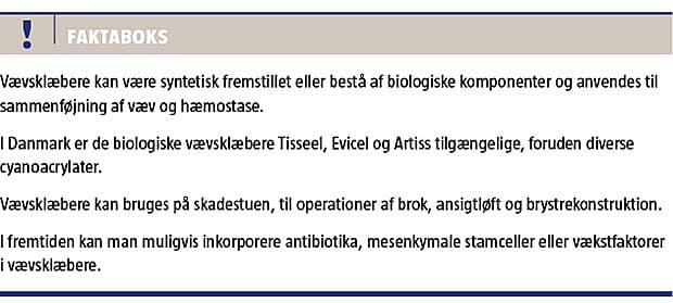 Kirurgiske fibrinklæbere bruges i forskellige specialer og har vist sig at være sikre ved bl.a. laparoskopiske og åbne lyskebrokoperationer [10-14] og for cyanoacrylater ved lukning af hud [2]. Fibrinklæbere og cyanoacrylater har en plads i kirurgien, og videre produktudvikling og forskning i produkternes anvendelsesmuligheder er klinisk relevant, bl.a. med mulighederne for at inkorporere antibiotika, vækstfaktorer eller mesenkymale stamceller [26, 27].