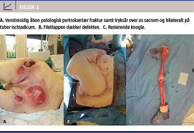 Han blev henvist fra et lokalsygehus til Plastikkirurgisk Afdeling, Telemark Sygehus, Skien, med henblik på vurdering af de rekonstruktive muligheder. Han fik konstateret en venstresidig åben patologisk pertrokantær fraktur på baggrund af osteomyelitis i hofteled og den proksimale femur. Derudover fandtes et tryksår på 15 × 15 cm over os sacrum og et tryksår med blottet knogle bilateralt på tuber ischiadicum, Figur 1A. Han var sengeliggende med konstant plejebehov og havde et omfattende forbrug af smertestillende medicin (> 100 mg oxycontin dagligt). Han havde desuden haft et vægtab på over 10 kg i løbet af det seneste år og havde et body mass index på 21 kg/m2. Ved ankomsten til sygehuset var han afebril, med en puls på 111 slag/min og et blodtryk på 91/56 mmHg, paraklinisk leukocytose på 14,8 mia./l, lidt forhøjet C-reaktivt protein-niveau på 27 mg/l og lavt hæmoglobinniveau, 10,3 g/dl (normalværdi: 13,4-17,0 g/dl).