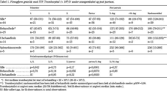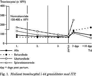 Resultater: Otte og fyrre kvinder med idiopatisk trombocytopenisk purpura fødte i 55 svangerskaber 61 børn, heraf 59 levendefødte. Første singleton-graviditet i observationsperioden (indeks-graviditeten) er benyttet i de statistiske beregninger, i alt 44 indeks-graviditeter. Hos mater kunne ses et trombocytfald fra 1. trimester til partus og en trombocytstigning tredje dag post partum (p<0,0001), også hos splenektomerede kvinder. 36% af kvinderne havde blødningsmanifestationer, ingen fatale. 33% af de nyfødte havde trombocytopeni i navlesnorsblod. Der blev fundet følgende risikofaktorer for perinatal trombocytopeni: tidligere fødsel af barn med trombocytopeni, svær trombocytopeni hos mater, hankøn. Nadir hos barnet indtraf indtil syvende dag post partum. Tidligere fødsel af barn med trombocytopeni synes at være risikofaktor for langvarig trombocytopeni i efterfølgende graviditet. Der var signifikant sammenhæng mellem maternelt trombocyttal i 2. trimester og trombocyttallet i navlesnorsblod.