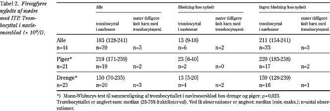 Det mediane trombocyttal i navlesnorsblod for børn med blødninger var 13×109 /l (9-18×109 /l). Hos drenge var det gennemsnitlige trombocyttal i navlesnorsblod lavere end hos piger (p=0,023). Neonatale blødninger var ligeledes hyppigere hos drenge end hos piger (Tabel 2 ).