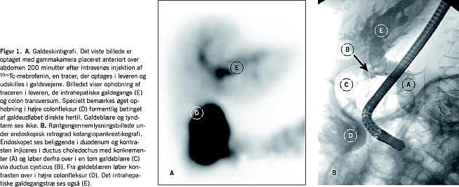 Ved en ultralydundersøgelse (UL) af abdomen blev der fundet luft i galdevejene. En efterfølgende koleskintigrafi viste en fistel fra galdeblæren til højre colonfleksur (Figur 1A). Ved en endoskopisk retrograd kolangiopankreatikografi (ERCP) blev der fundet sten i ductus choledochus og kontrastoverløb fra galdeblæren til colon (Figur 1B). Der blev udført sfinkterotomi og stenfjernelse fra ductus choleodocus. Man afstod fra kolecystektomi på grund af patientens alder.