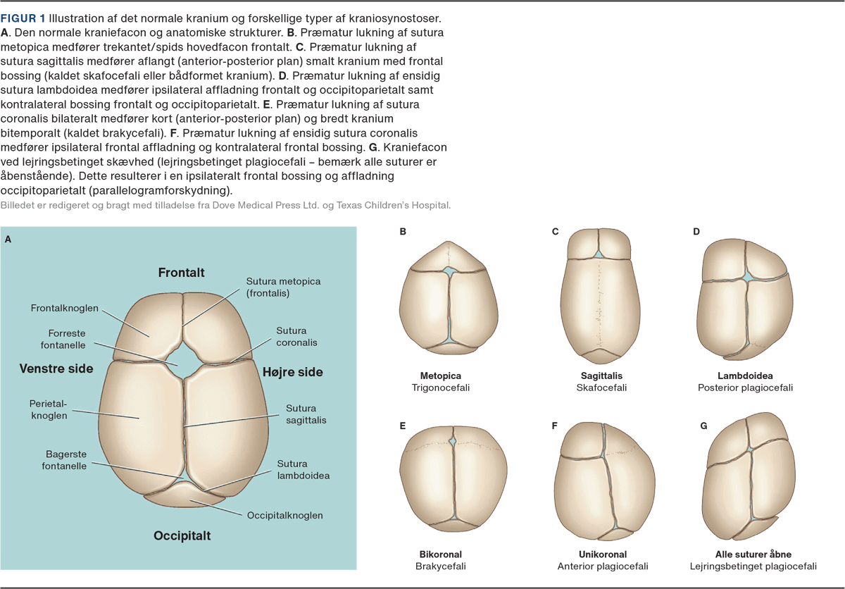 Kranieknoglerne er sammenholdt af et fibrøst bindevævslag, som betegnes suturer. Sutura metopica, sutura sagittalis, sutura coronalis og sutura lambdoidea er de største og mest betydende for kraniets vækst (Figur 1 A) [1]. Suturerne tillader ekspansion og modellering af kraniet, hvilket er nødvendigt, da en stor del af hjernens udvikling foregår det første leveår og allerede har opnået op mod 80% af sin størrelse i andet leveår [2]. Kraniosynostose (KS) betegner en lidelse med præmatur lukning af én eller flere suturer.