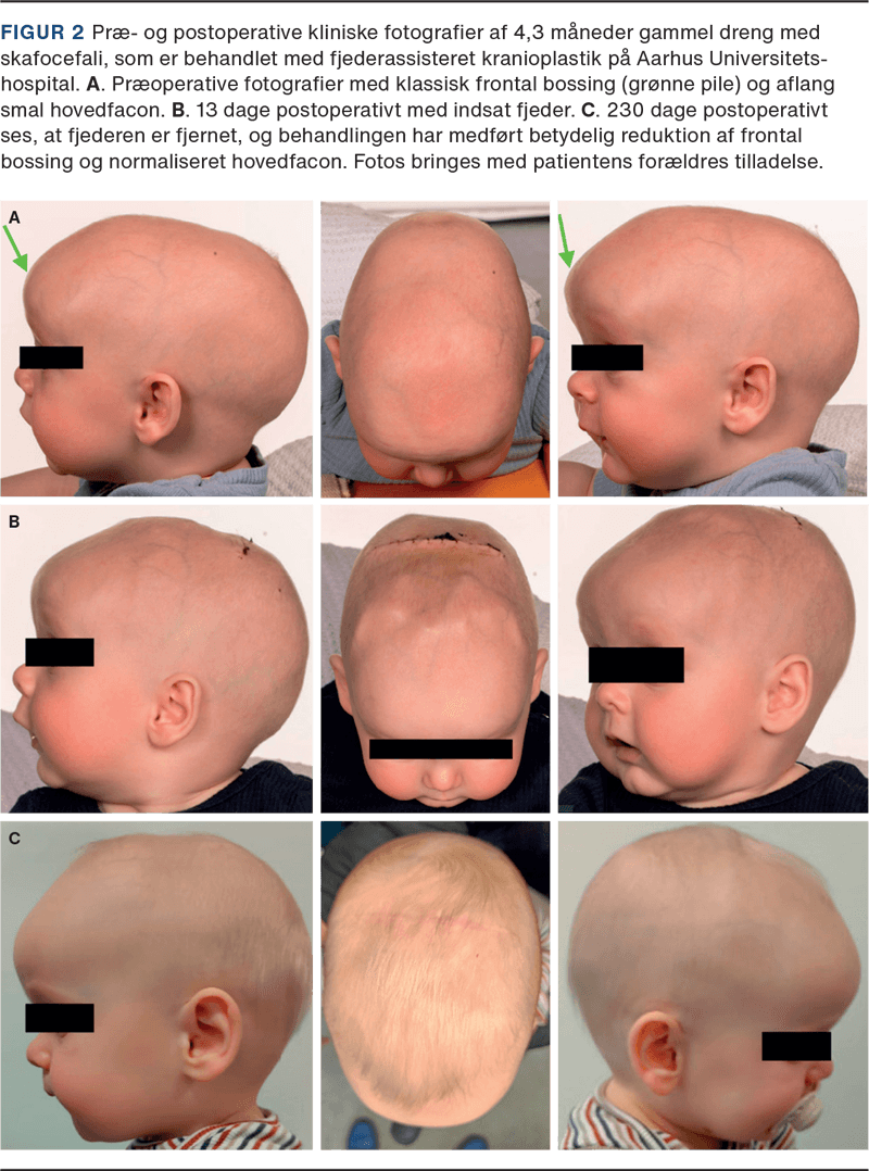 Fjederassisteret kranioplastik (FAK) er egnet til simple enkeltsynostoser, hvor der ikke er behov for korrektion af multiple suturer eller ansigtsdeformiteter. Modsat ÅRK er operationen normalt kun effektiv hos børn yngre end seks måneder, hvor kranieknoglerne stadig er elastiske og kan remodelleres over tid ved at frigøre den fusionerede sutur og anvende en fjeder til distraktion. Klinisk resultat af teknikken illustreres i Figur 2 [7, 18].