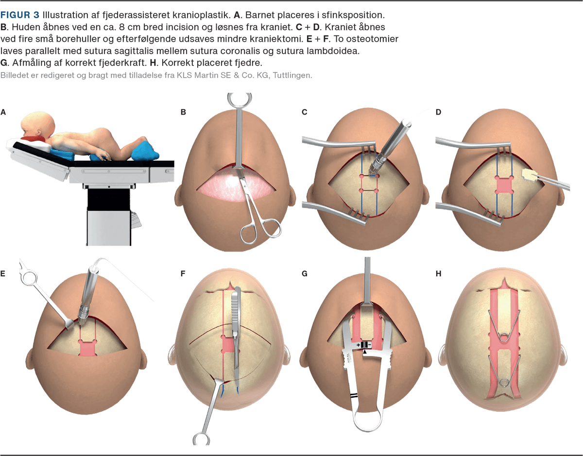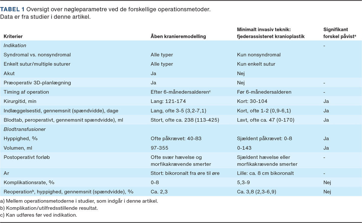 Den konventionelle operationsmetode i Danmark har de sidste mange år været ÅKR, men for nyligt har man introduceret fjederassisteret kranioplastik (FAK). ÅRK og endoskopisk behandling kan anvendes ved alle typer synostose inkl. multisynostoser og syndromer. FAK anvendes hovedsageligt til nonsyndromal enkeltsynostose af sutura sagittalis, som også er den eneste indikation i Danmark [7]. I det følgende afsnit beskrives de forskellige operationsteknikker til denne tilstand med fokus på FAK. Endoskopisk assisteret kranioplastikbehandling anvendes ikke i Danmark. Hver operationsmetode har fordele og ulemper (Tabel 1).