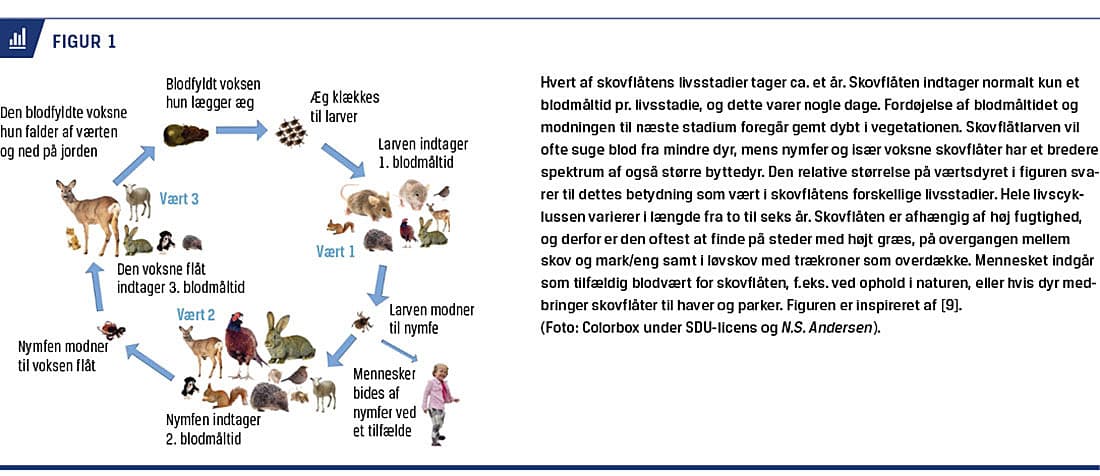 Skovflåten, Ixodes ricinus, findes udbredt i den danske natur, og den er aktiv fra tidligt forår til sent efterår [1-8]. Skovflåten har tre livsstadier: larve, nymfe og voksen. Den bliver oftest inficeret af mikroorganismer, når den i larve- eller nymfestadiet indtager et blodmåltid fra små gnavere (Figur 1). Dette muliggør, at skovflåten under næste livsstadie, som hhv. nymfe eller voksen, kan overføre mikroorganismen til et nyt dyr eller et menneske og dermed potentielt forårsage sygdom. Transovarial overførsel af mikroorganismer til næste generation af skovflåter ses sjældent. Da der, som det fremgår, er flere muligheder for infektion/kolonisation, kan skovflåten bære på flere humant patogene agenser samtidig [10].