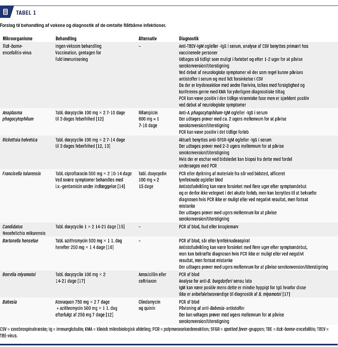 Der er ud over B. burgdorferi sensu lato en række andre patogene eller potentielt patogene mikroorganismer, som kan overføres af skovflåten. En del er først blevet identificeret eller erkendt som patogene i de seneste år, hvorfor vores viden om symptomer og den mest effektive behandling er begrænset. Flere af disse nyopdagede mikroorganismer er i de seneste år også blevet påvist i Danmark [1-8], ligesom velkendte patogener findes på nye lokaliteter [11]. Da der lejlighedsvist omtales nye flåtbårne sygdomme i medierne, kan lægerne møde patienter, der er bekymrede for smitte. Formålet med denne artikel er derfor at give et overblik over ætiologi, forekomst, klinik, diagnostik og behandling af de mindre hyppige af de i Danmark forekommende, ikke importerede, flåtoverførbare infektioner. Behandlingsforslag og diagnostiske tiltag fremgår af Tabel 1. For de patogener, som man har begrænset klinisk erfaring med, er forslag til behandling og diagnostik baseret på kasuistikker og anbefalinger for lignende mikroorganismer.