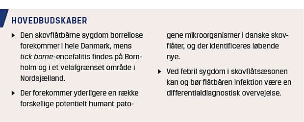 Det er derfor nødvendigt med vedvarende overvågning og opmærksomhed på skovflåtbårne infektioner for at afklare omfanget af problemet, og hvilke patogener man potentielt udsættes for ved skovflåtbid i Danmark. Der er tale om sjældne sygdomme, men vi anbefaler, at flåtoverførte mikroorganismer i skovflåtsæsonen medtages i de differentialdiagnostiske overvejelser hos febrile patienter, der har en anamnese