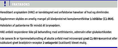 Akut anfaldsbehandling anvendes til hævelser i hoved-hals-området, smertefulde maveanfald og progredierende perifere ødemer. Anfaldene kan behandles med humant C1-INH-koncentrat som Berinert, der blev indregistreret i Danmark i 2009, men har været anvendt til behandling af alvorlige HAE-anfald igennem knap 30 år. I 2010 blev conestat alfa (Ruconest), der er en rekombinant C1-INH udvundet af kaninmælk, indregistreret i Danmark, og i 2011 blev et nanofiltreret humant C1-INH-koncentrat, Cinryze, indregistreret. C1-INH-præparaterne administreres intravenøst, og flere patienter er blevet oplært i hjemmebehandling [23]. Siden 2008 har det været muligt at anvende icatibant, der er en bradykinin B2-receptor-antagonist, som blokerer virkningen af den aktive angioødemmediator. Icatibant indgives subkutant og er godkendt til hjemmebehandling. For alle de nævnte præparater foreligger der dobbeltblindede, placebokontrollerede fase III-studier [24-27]. I praksis betragtes lægemidlerne som ligeværdige til behandling af akutte anfald.